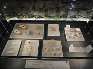 Exemplo de moedas encontradas nos sepultamentos (enterramentos) expostas no interior da igreja de São Pedro de Caneferrim.